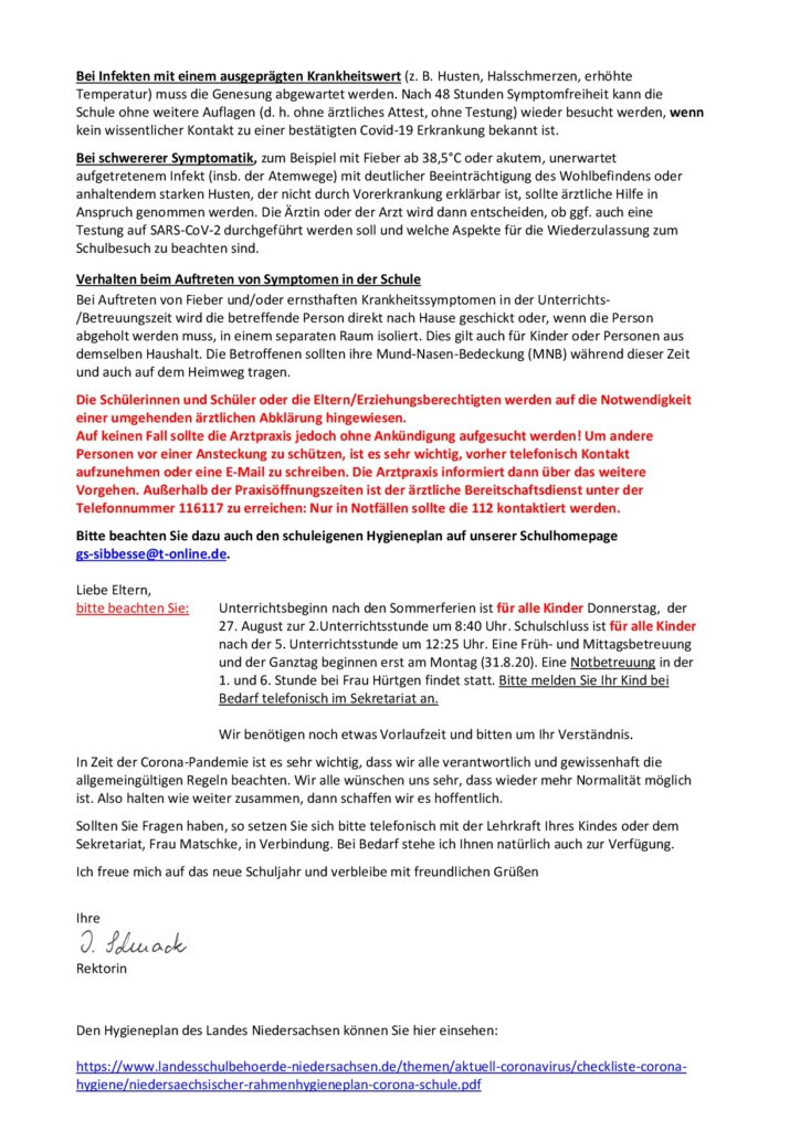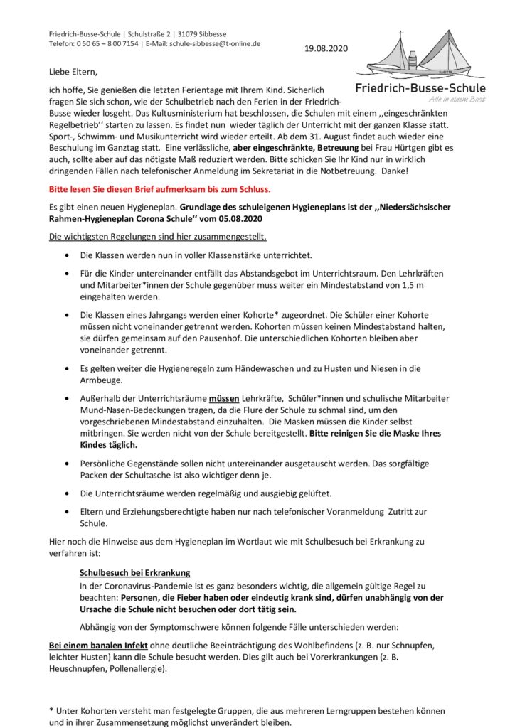 Elternbrief zum Schulstart 20/21
