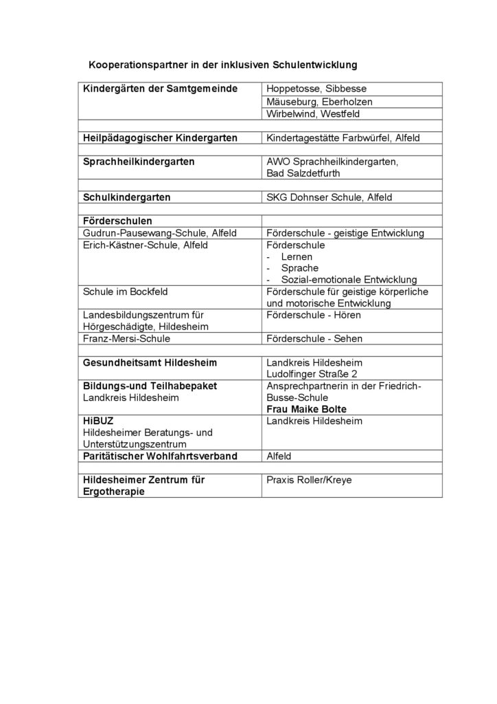 Für die Beantwortung allgemeiner Fragen zum Thema Inklusion stehen neben den Regionalen Beratungs- und Unterstützungszentren Inklusive Schule (RZI) die Fachbereichsleitungen Inklusive Bildung in den Regionalabteilungen der Niedersächsischen Landesschulbehörde zur Verfügung. Weitere Informationen finden Sie unter http://www.mk.niedersachsen.de/startseite/aktuelles/einfuehrung_inklusiven_schule/einfuehrung-der-inklusiven-schule